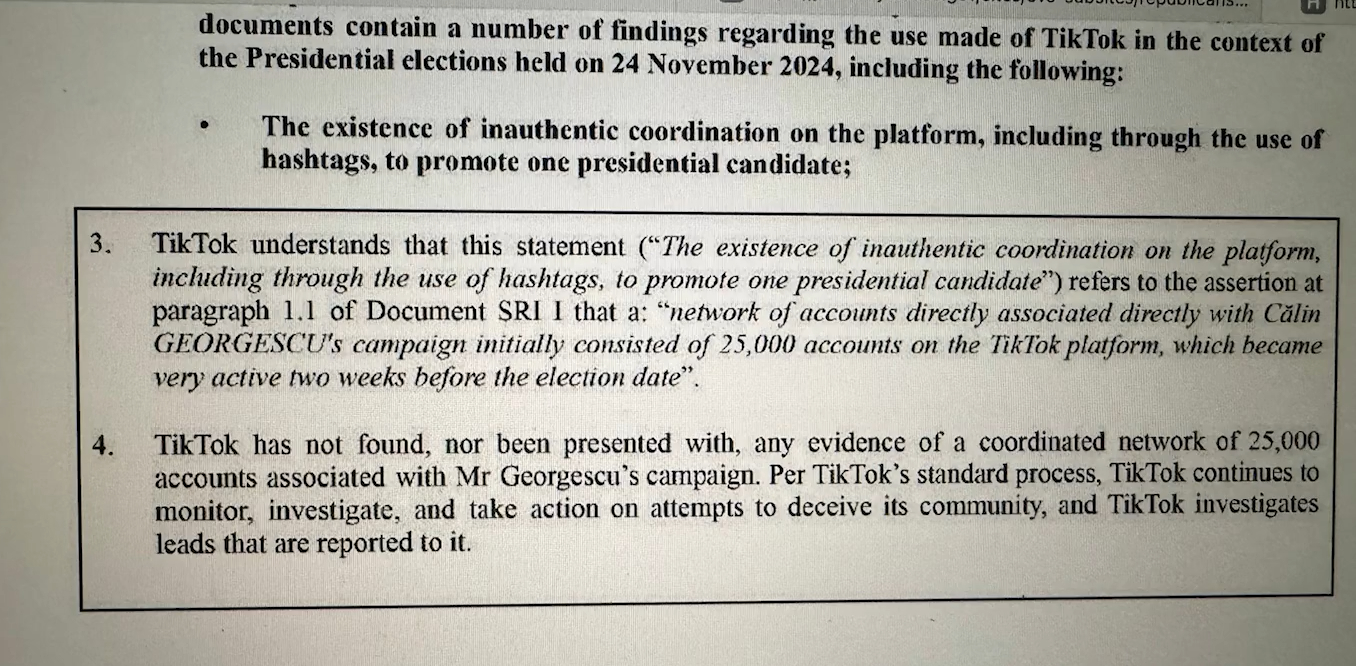 „TikTok înțelege că această afirmație (…) se referă la susținerea din paragraful 1.1 al Documentului SRI 1 conform căreia o ‘rețea de conturi asociate direct cu campania lui Călin GEORGESCU a constat inițial în 25.000 de conturi pe platforma TikTok’.”