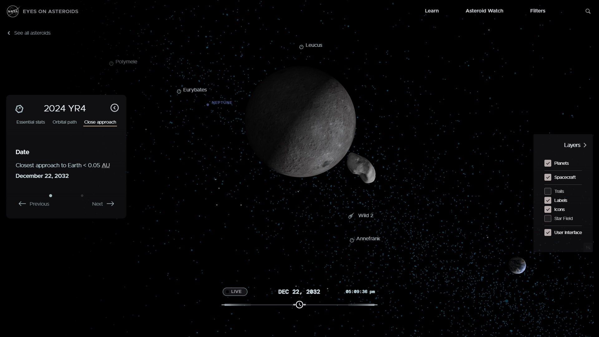 Orbita actuală: Apropiată de Pământ, cu o intersecție potențială în 2032